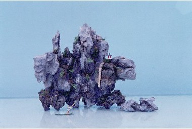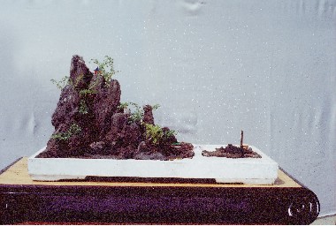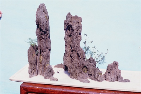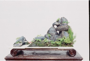 《别有天地》独石写意盆景,英德石,天然形成一个仙境般的小天地,前面一个低不堪称山而有迂回曲折的山脉,中部林木苍郁,低处又象有小农田,稍高处有亭,可达半山,有小屋,其中有人,小屋之后可达小山峰,其背后是否还有较低山地,则未可知,岛屿右边,似从第二个岛屿的一角架桥,正在行近,即将来访此岛的仙人,此岛右边海面(又象云天)开阔,远处有舟,好象有仙人出游。