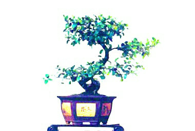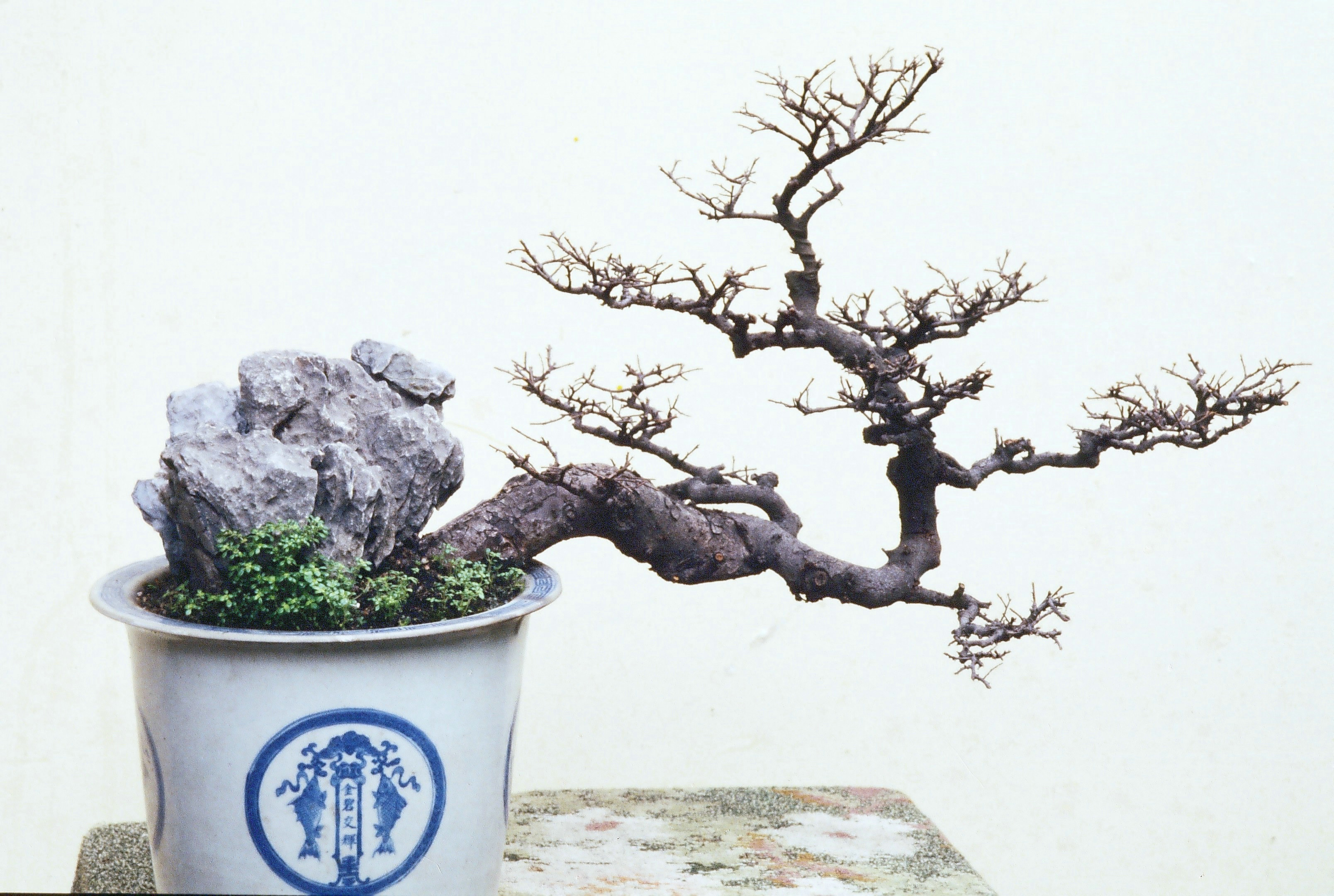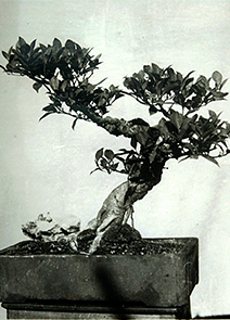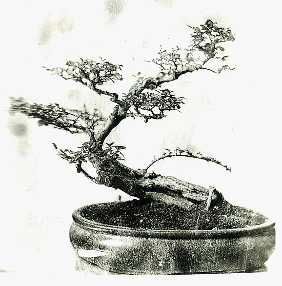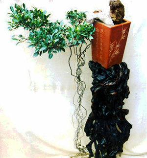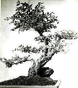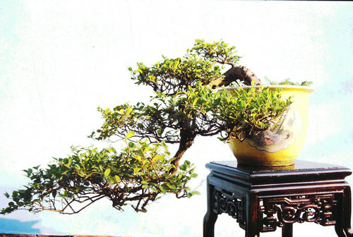 世称李白为诗仙。此盆栽似醉了的李太白,左右颠簸,欲倒又立,颇有醉态,可是脚跟牢固。主干多节,经前后左右转折而成一个“勾”形,枝梢上挺有力。它仅有两侧枝,造成了很完整、灵活、自然的树形,根蔓几乎全露。苍老瘦劲,年已逾周甲。一见可知为长期约束在盆中的植株(此盆景为首页“诗仙”的原作)。