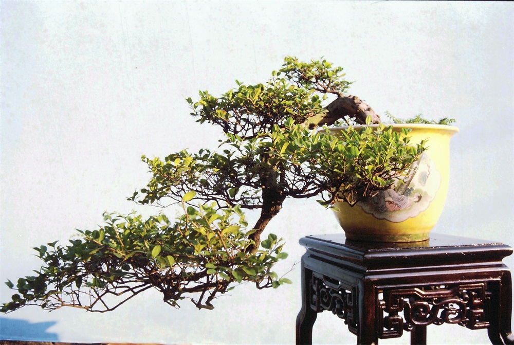 这株悬屋盆栽的造型非常别致,像从峭壁石缝向外伸,到达适当长度就往上翘,同时向前后左右自由地发展,完全符合天然的悬崖树生长规律。其构图无疑是经过精心琢磨的。主干经过千屈万曲然后形成,可见其生长过程的艰难。侧枝也经过千锤百炼,达到铿锵有声的地步。姿势秀丽婀娜、娉娉婷婷,矫健泼辣。不疏不密的叶缝里露出美丽的枝干,确是“轻罗露玉肌”。由于疏密相间,其树冠恰如朵朵菊花,全株正如邻园秋菊越过篱笆来,令人很自然地想到“庭树晓莺窥户语,邻园秋菊过篱生”的诗意。