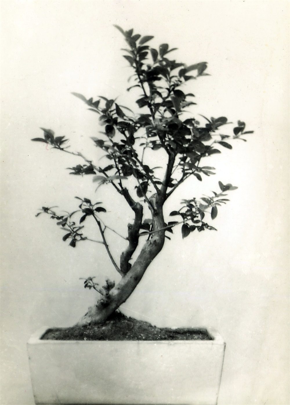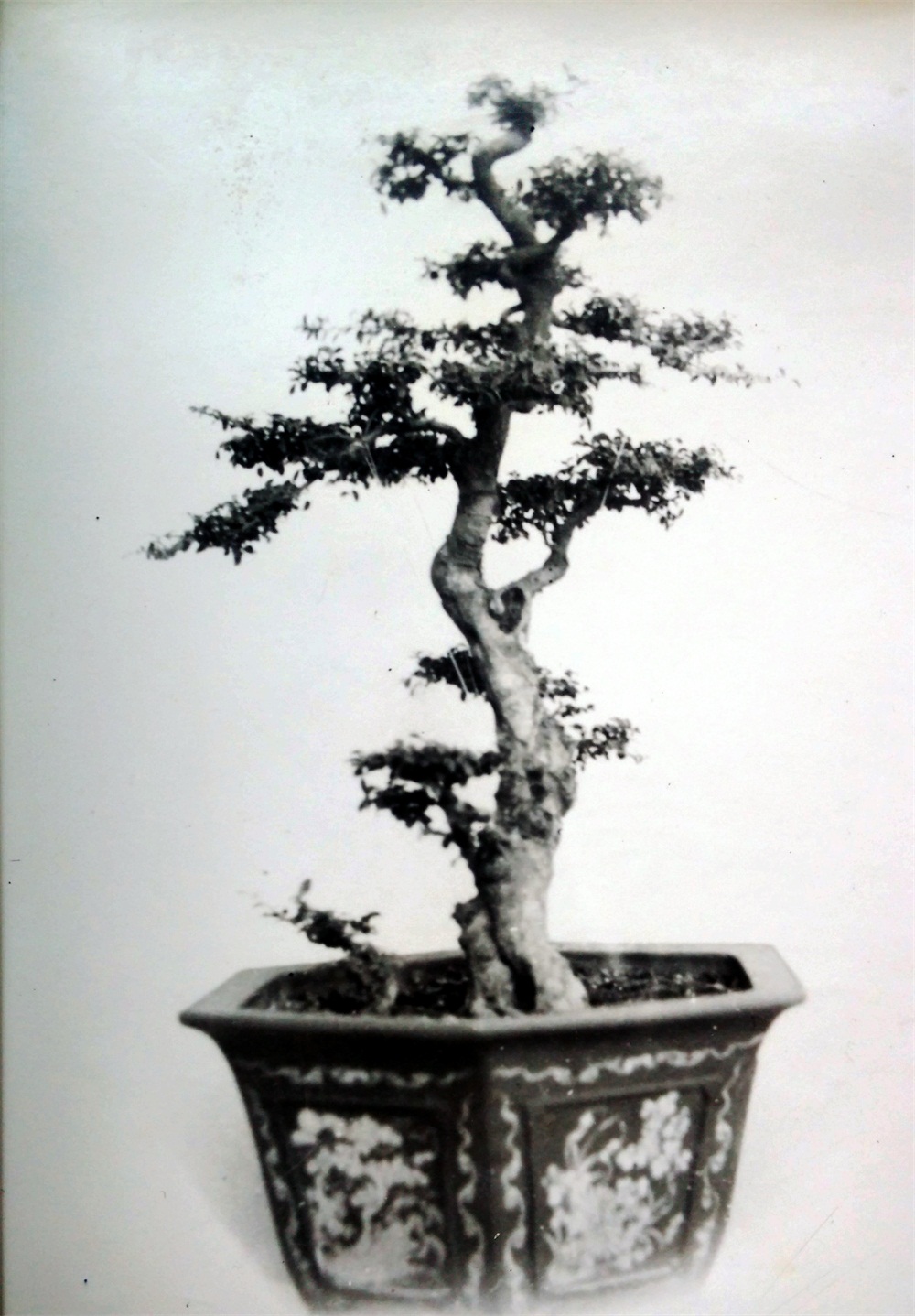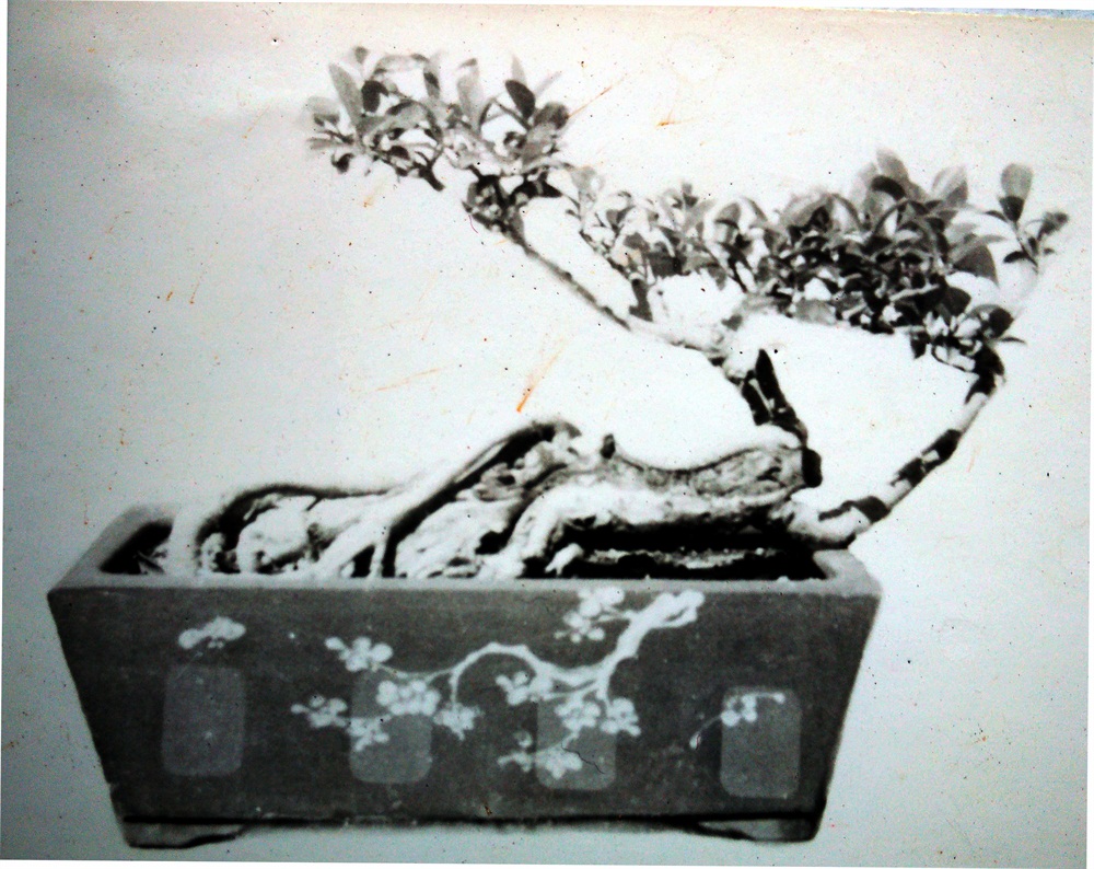 全株结构严紧,疏密非常调和。树干的粗细与高度的配合、树身高度与侧枝长度的配合都极恰当。其势略向左倾斜,而基部阔大,亦向左方及前后方伸展,故格外均衡稳固。侧枝、主枝也分别向前后左右伸出,有四顾的神态。树冠齐又不齐,组成浑朴庄重的画幅。气势雄健刚强,苍老的粗根高高露出盆面,树皮古厚,或成团凸起,或深深凹陷,叶不密不疏,是千锤百炼、苍老古朴的作品。乍看之淡朴,却是越看越有神。树龄一百五十岁,此树是从小在盆里培育起来的。