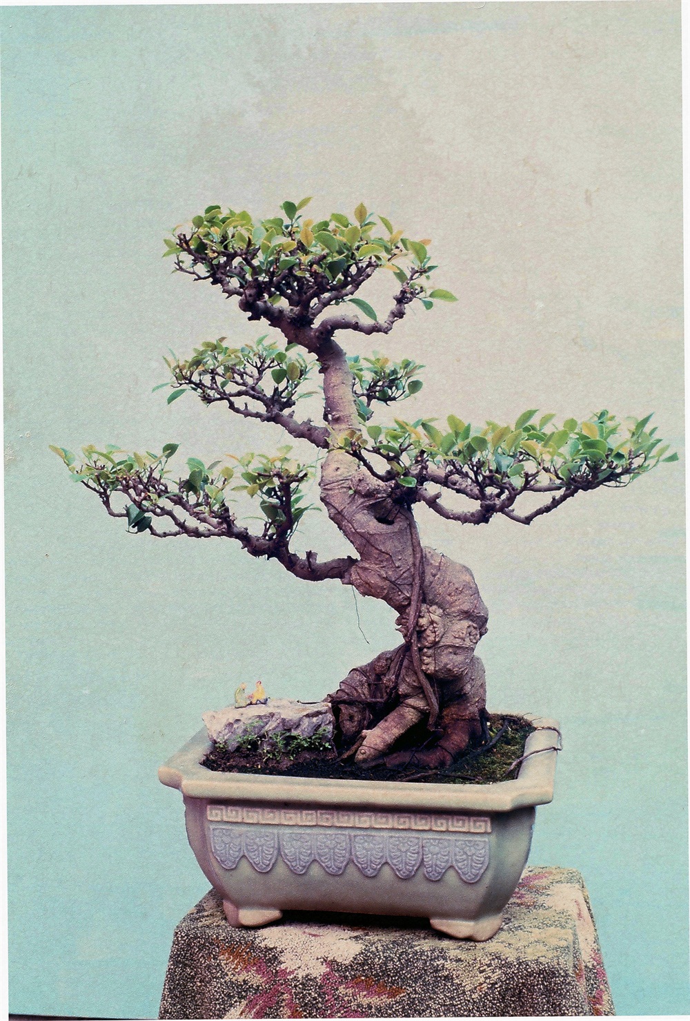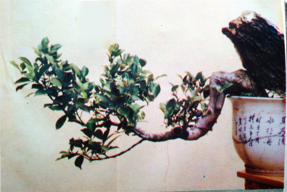 卧式盆栽一定要注意符合植物生长规律,不可人为地偃卧,否则流于怪诞。这株的根系和气根都向下扎,树干露出土面后即转折向右卧生而不着地,纯属天然姿势,这是它难能可贵之处。它遇到恶劣的天气或外界的摧残,主干末段因而枯死,下段木质亦枯朽,仅存树皮。然后枯木逢春,再生一枝主干,一枝副干,重新繁盛起来。双干都向左上方斜生,与卧生的主干形成45°曲线,副干处于偏侧位置,作相辅相成之势,主干又分二侧枝,从而构成左右前后四向的树冠。这样,全株均衡稳重、结构具有特殊风度,且气势生动,疏而不茂的树冠与枯朽的树干配合异常协调,苍老简朴。树龄百岁以上,比卧龙居士长寿。神韵则高卧幽逸,既似卧龙,又胜卧龙居士。
