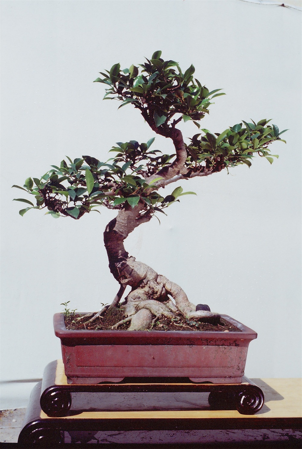 这株神态有飘飘然之感。树干刚柔兼备,极其自然,实际上也很少加工,是美的自然树。斜干倾斜到一定程度就向上翘,颇有气势。两树干亲密无间,副干表现依偎于主干怀抱,有若母子,是双斜干的好姿势。