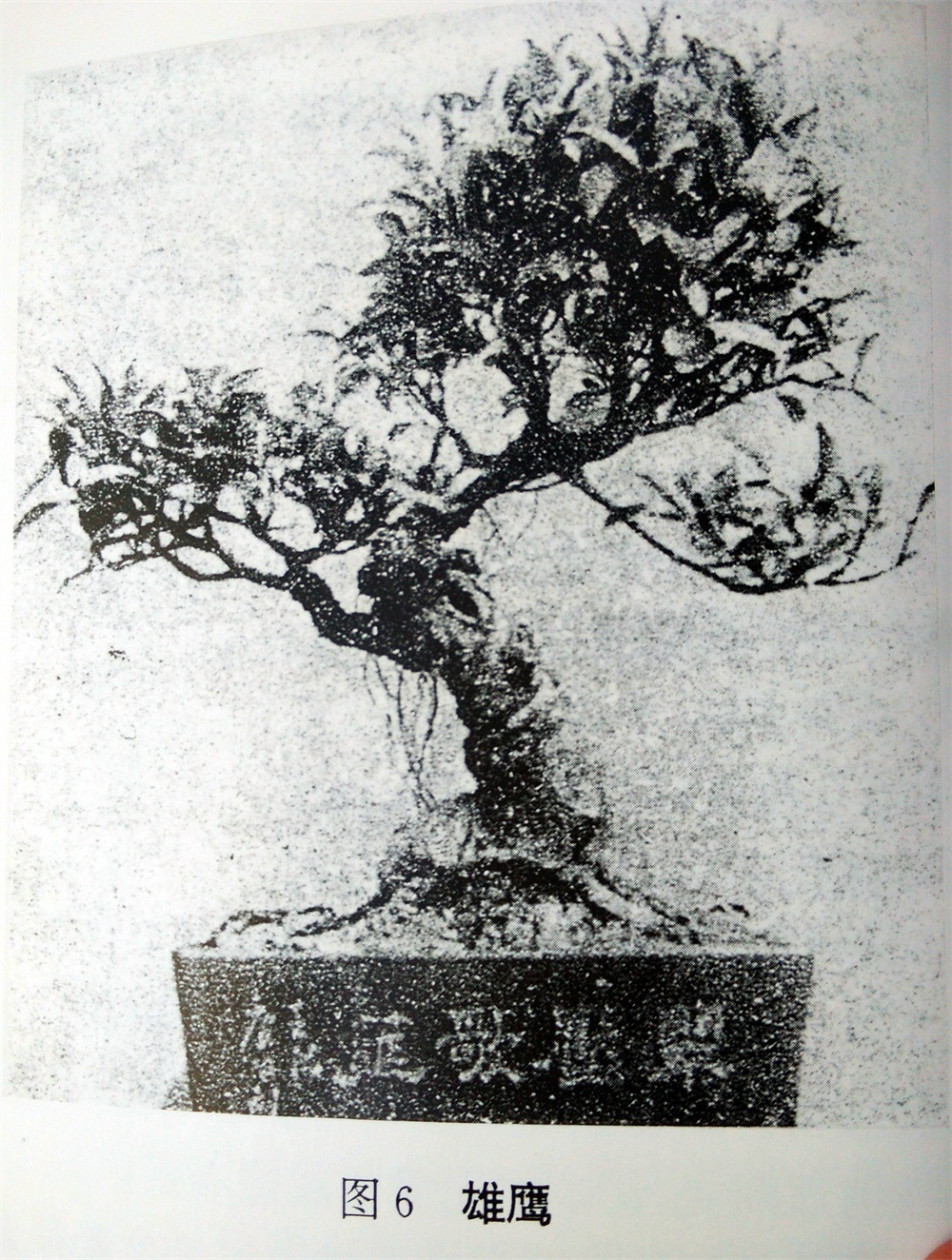 全株神态仿佛似雄鹰俯瞰。两个老大的翅膀向上举,作下降飞翔之势,向下俯视,似正在寻找其目的物。画家往往把雄鹰比作伟大的,或英雄的人物,或喻为伟大的国家。这株盆栽也具有这样的诗情画意。这株盆栽结构具有简练、紧结、多变的手法。主干精短又多节,节节有力,从而塑成四向屈曲有气魄之姿势;同时仅用二个大树冠、一个飞树冠(从特殊的位置培育出一枝较细的侧枝,放到适当的位置,然后让它长叶形成的小树冠称为“飞树冠”),这样简单的结构就造成一个灵活多变、生动有力、神态巧妙的树姿,在塑造艺术上是比较成功的。