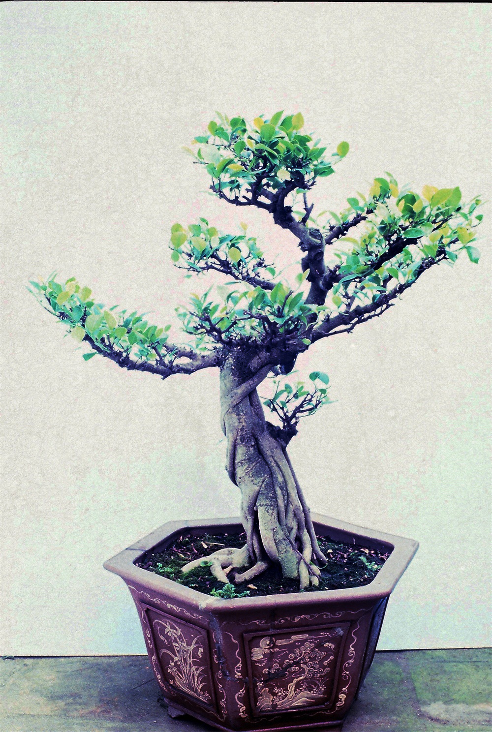这株气势矫健,树形如立凤,树干如滚龙,从下至上有力地旋转一圈而挺立。侧枝左右伸展却似凤展翅,回头迎人,笑顾可掬,状欲高飞,神态自然、优美、活泼。全身披满气根,不粗不细,与树干比例恰到好处,并同树干浑化为一体。气根落地又与树根结合并向前后左右伸展,形如莲花宝座,使全株显得格外稳固。下半段较疏之处点缀一小枝,犹如锦上添花。树皮已龟裂,树龄四十岁,是从火柴杆那么大培养起来的。株姿势好,难度大。