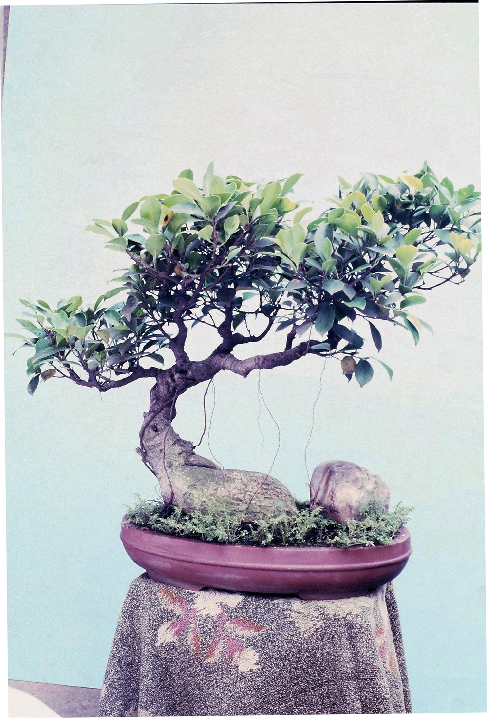 1.首先是根蔓隆起露出土面,或高或低或粗或细,如龙如蛇,盘横在树头的周围,布满盆面,又纵横自然不乱,或根条粗大结成块状。如榕、枫、松等植株,根窝都可结成块,则弥觉趣味无穷。如果是榕树的块根,单个者则要形状好、灵巧不呆板,二个以上者则要紧紧结成一气,不要泛散各自西东。基部有块根又有气根,则应以块根为主,气根不宜多、不宜粗,同时块根、根蔓都宜苍老作龟裂,这样就显得老。