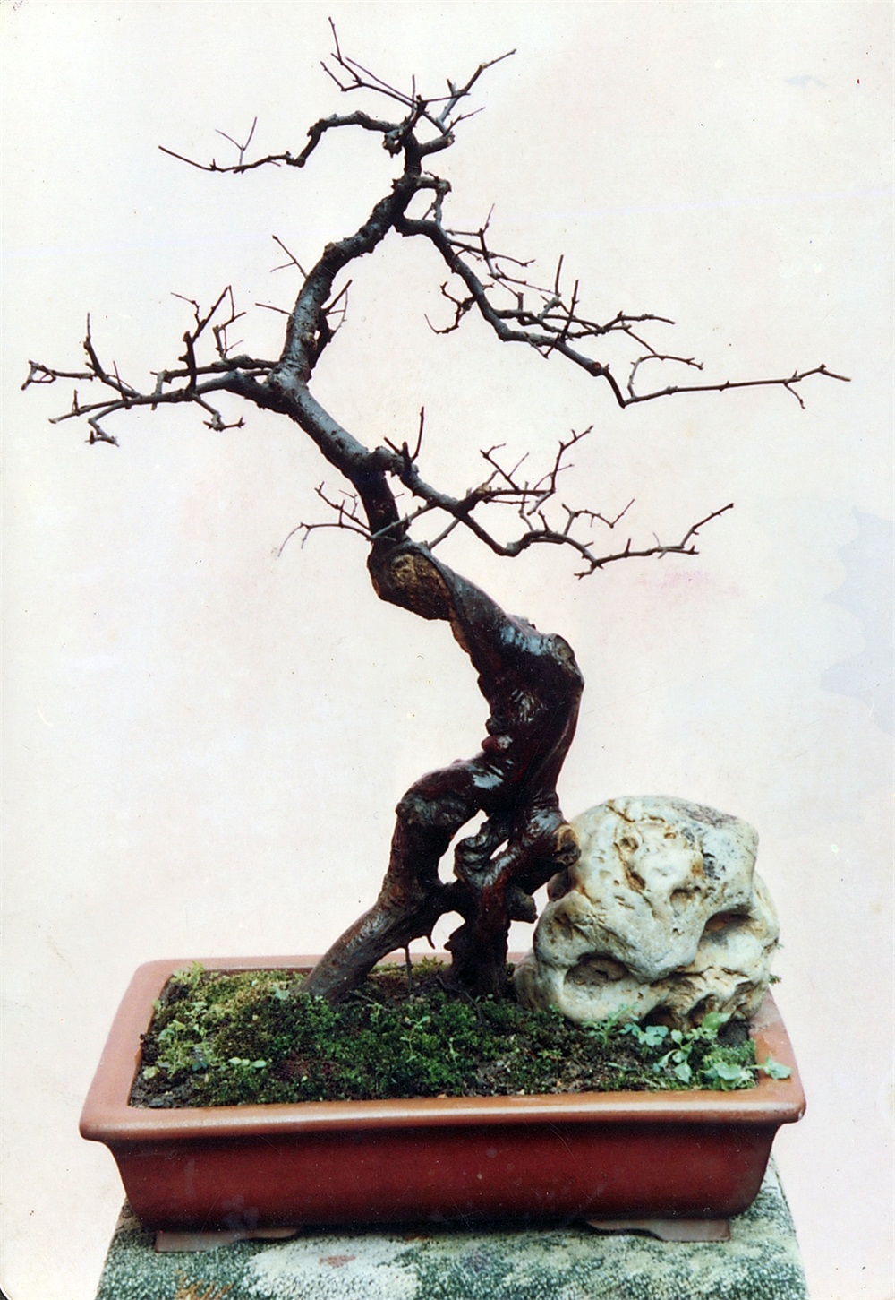 这株状如自由式游泳,故题。基部阔大,根蔓左右伸展甚宽,右边根蔓向下扎,树干横伸长度适当,因而形成稳固均衡之势。主枝上翘,斜度恰到好处。全株上下粗细配置很理想。