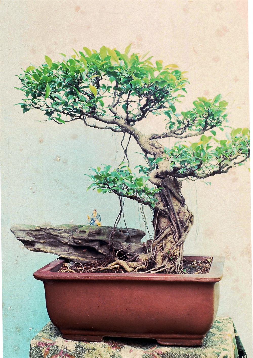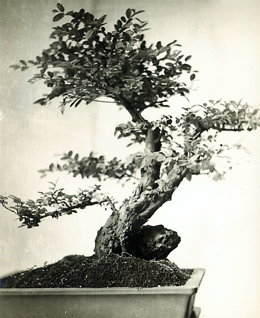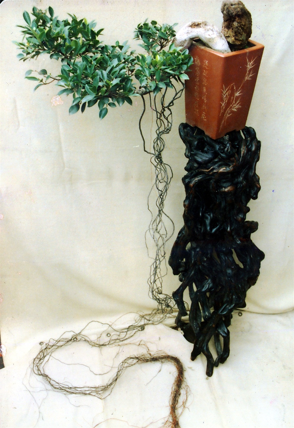 陶潜诗“停云霭霭”好像是为这株盆栽写照。它的树冠似天空的朵朵彩云,欲行又止,舍不得飞去。它的基部和根蔓已布满盆面,非常苍老,自然而不纹,块根与气根构成主干的第一、二节,气根又和主干构成主干的第三、四节,都已融合为一体。它是自小在盆里。培育而成的,这是它的“难”度突出表现,也是其他品种植株不可能具备的条件。主干朝着前后左右四向屈曲有力,轻松地顶着沉重的树冠,显得稳固均衡。全株的疏密都恰到好处。树皮古厚龟裂,已是一百多岁的高龄了,却犹有寿而康的气慨。此盆栽具有各方面的优点,难度特高。