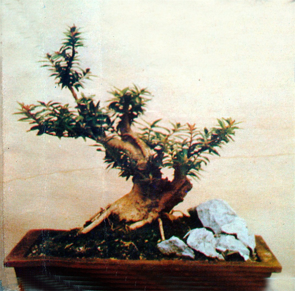 世称李白为诗仙。此盆栽似醉了的李太白,左右颠簸,欲倒又立,颇有醉态,可是脚跟牢固。主干多节,经前后左右转折而成一个勾形,枝梢上挺有力。它仅有两侧枝,造成了很完整、灵活、自然的树形,根蔓几乎全露。苍老瘦劲,年已逾周甲。一见可知为长期约束在盆中的植株。