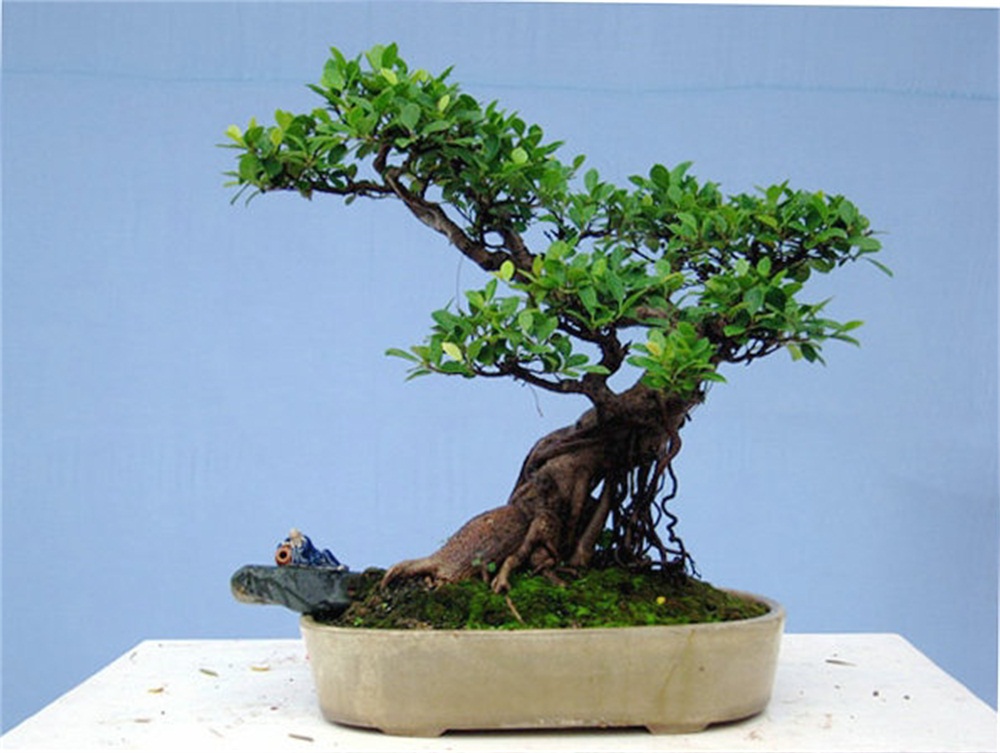难度高首先要有一定的姿势,不可孤立,否则必流于怪诞。曾有一榉树,干短而粗,直如木桩,树冠如复鼎,丝毫不象树,无美可谈,这种难度无任何意义。因此,盆栽首先应该似一株美的自然树,只有在此前提下讨论难度才有意义。例如图27就是在姿势好的基础上,表现其气根、块根、树干拧成一体,很自然,毫不带勉强之意,树龄已经一百多岁,是从小就在盆中培育起来的,这才是真正的“难”。又如图28,其块根多又大,形态又好,又团结得很紧密,形如盘石,与树干配合得很和谐,并且树干姿势好,也是从小在盆里培养起来的,已经一百多岁了。这样的盆栽,才算难度高。再如图11,它在恶劣的环境中,经过“几回死去几回生”而活了三百岁,构成双干,如蹲狮之形,这株难度主要表现在树龄。有的难度则表现在塑造技巧方面,例如图29、30。