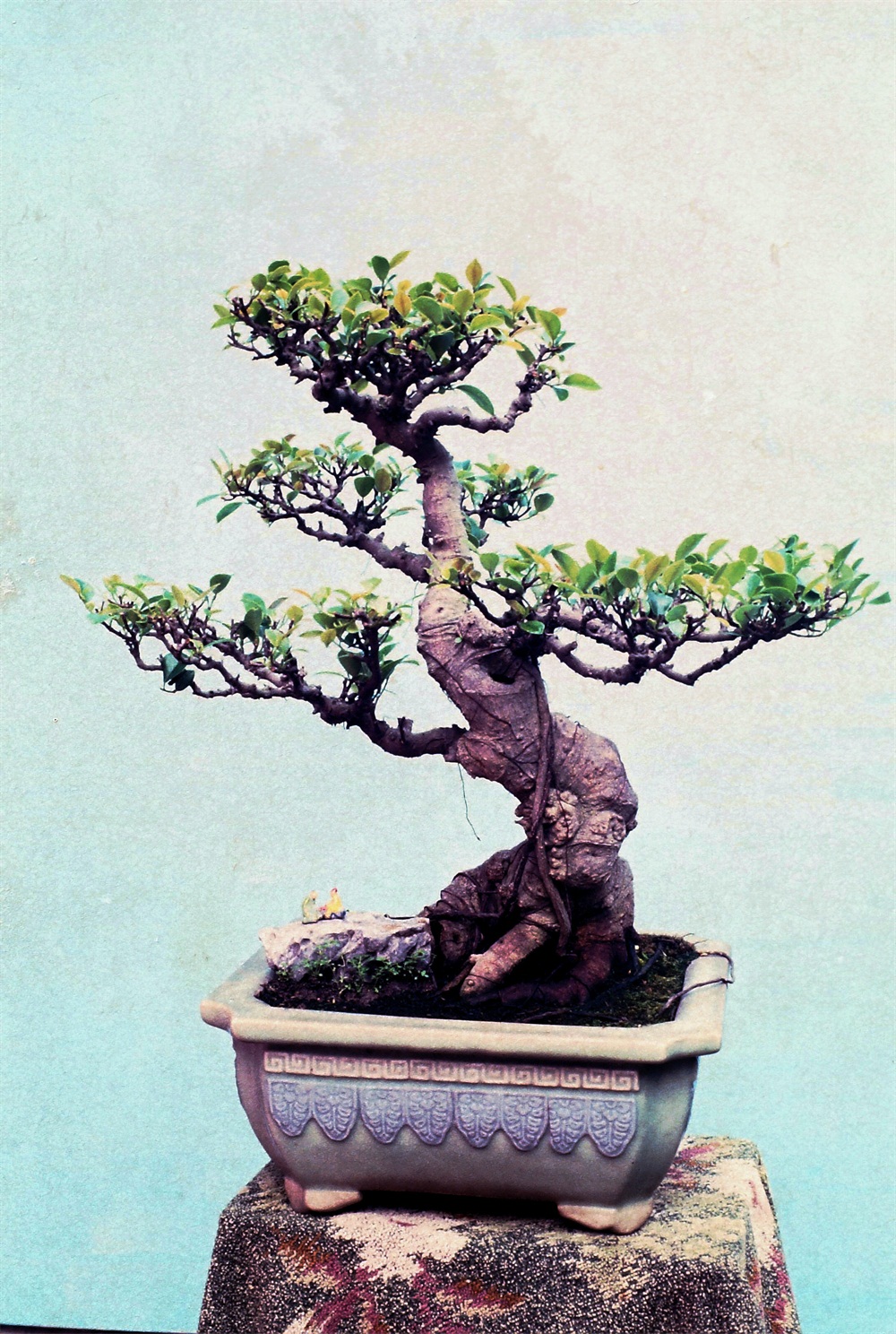 关于盆栽的“老”,耐翁先生根据他多年的经验总结应有以下几种形态:根蔓隆起,树干多屈曲多节,树皮厚,龟裂或成皱纹而粗,枝干多曲折,呈逐年整剪或枯死重生之状,枝叶不太茂密,因为只有年轻健壮的植株才可能枝繁叶茂。榕树高处有气根下垂等(《盆栽技艺》P19-20)。