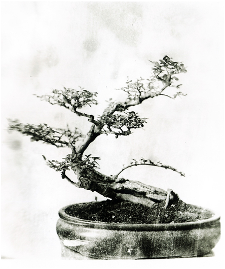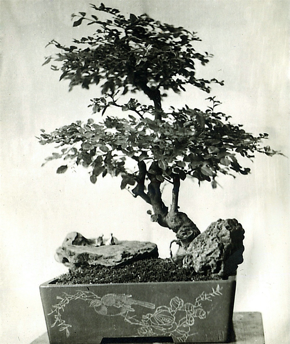 全株结构严紧,疏密非常调和。树干的粗细与高度的配合、树身高度与侧枝长度的配合都极恰当。其势略向左倾斜,而基部阔大,亦向左方及前后方伸展,故格外均衡稳固。侧枝、主枝也分别向前后左右伸出,有四顾的神态。树冠齐又不齐,组成浑朴庄重的画幅。气势雄健刚强,苍老的粗根高高露出盆面,树皮古厚,或成团凸起,或深深凹陷,叶不密不疏,是千锤百炼、苍老古朴的作品。乍看之淡朴,却是越看越有神。树龄一百五十岁,此树是从小在盆里培育起来的。这株树的美在哪里?耐翁先生从结构、疏密、根、干、叶、树皮步步深入欣赏其形态神韵,并画龙点晴地给它题名为“阅尽人间春色”,寓意深长。