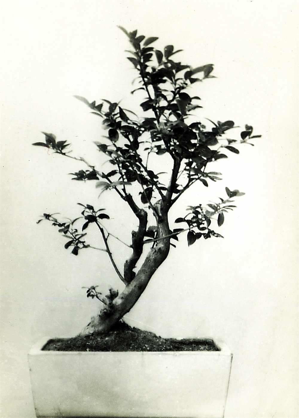 这株神态有飘飘然之感。树干刚柔兼备,极其自然,很少加工,是美的自然树。斜干倾斜到一定程度就向上翘,颇有气势。两树干亲密无间,副干表现依偎于主干怀抱,有若母子,是双斜干的好姿势。如果以一种纯粹观看的角度来看这株树,只不过是一大一小两根倾斜的树枝而已,而我们欣赏的是双斜干盆栽自然的姿势而又形同母子相互依偎。美在姿势自然又形同母子的韵味。