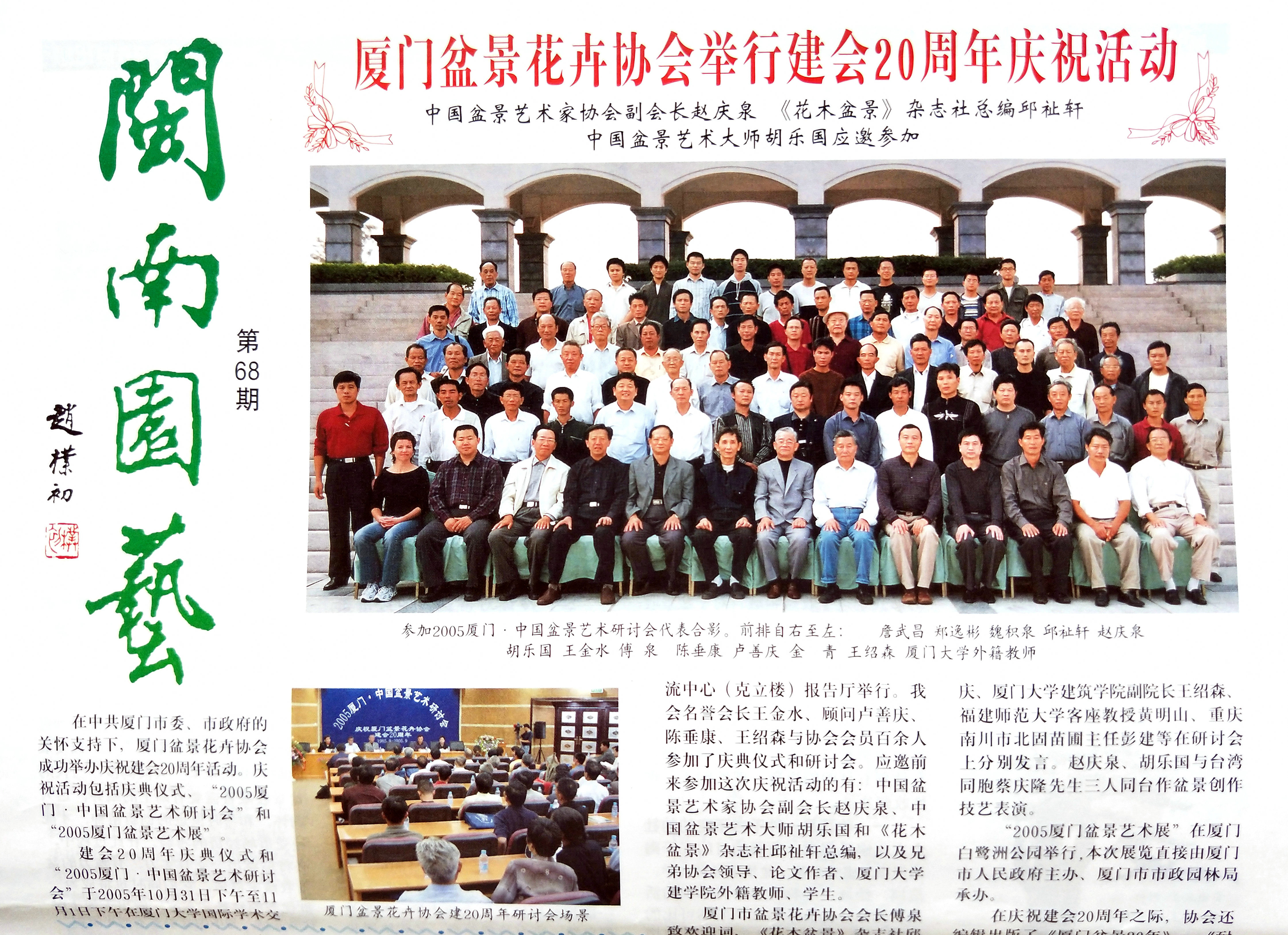 厦门盆景花卉协会是耐翁先生在厦门市政协主席施能鹤大力支持下团结闽南盆景爱好者于1985年9月8日创建,1991年首批登记通过为法人社团,在册会员人数5百余人。分布在以厦门为中心的闽南沿海一带(接下页)
